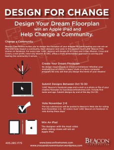 Beacon Fine Homes & Custom Pools is a local home builder in OK. They’ve launched their Design for Change contest! You can design your dream floor plan to impact a community and for a chance to win an iPad! Beacon will donate $1 to Cross And Crown Mission for every Facebook ‘LIKE’ they receive during the contest! Visit the Web Site for all the contest details. Please take five minutes to help us raise funds to help our community!